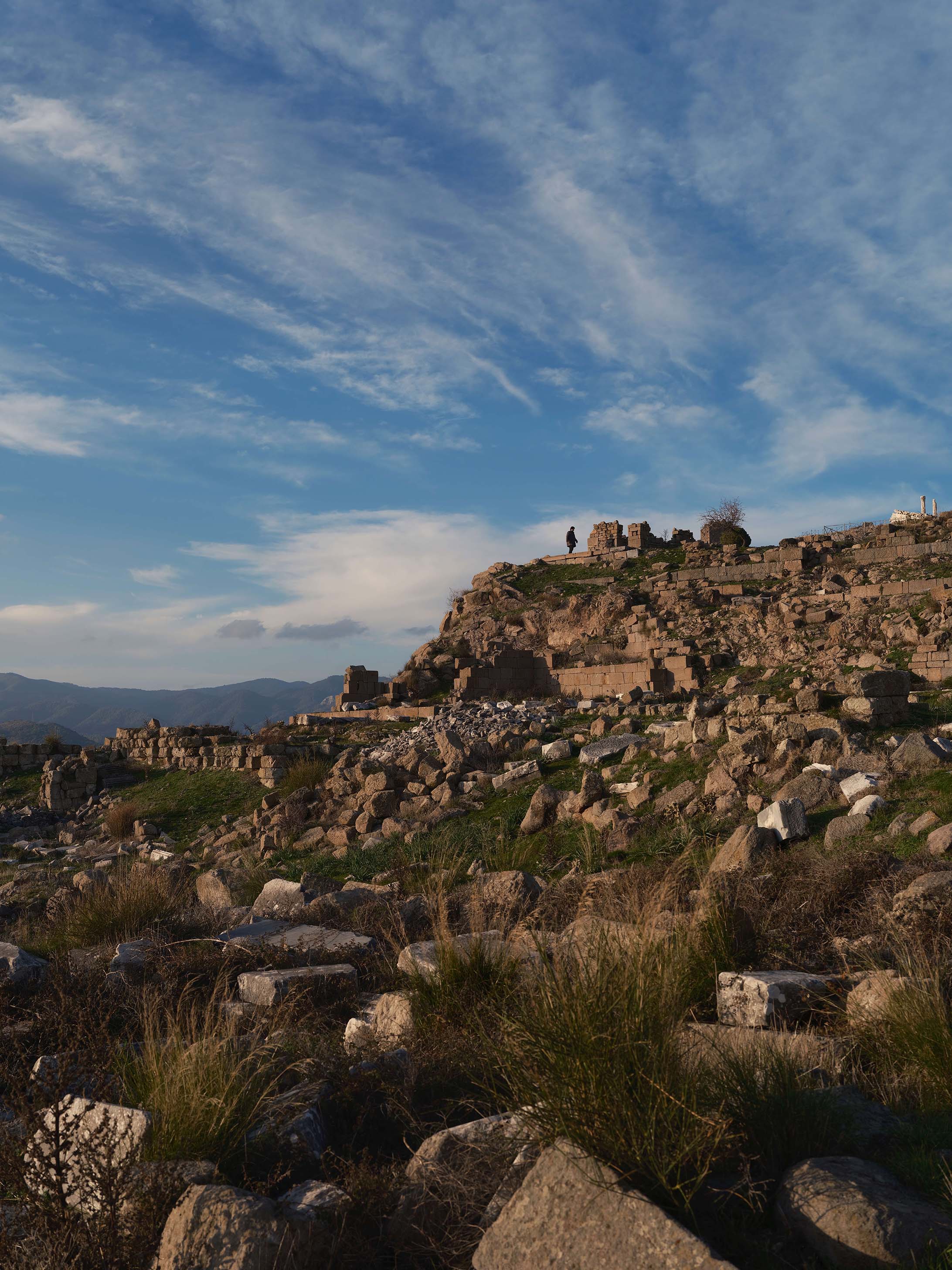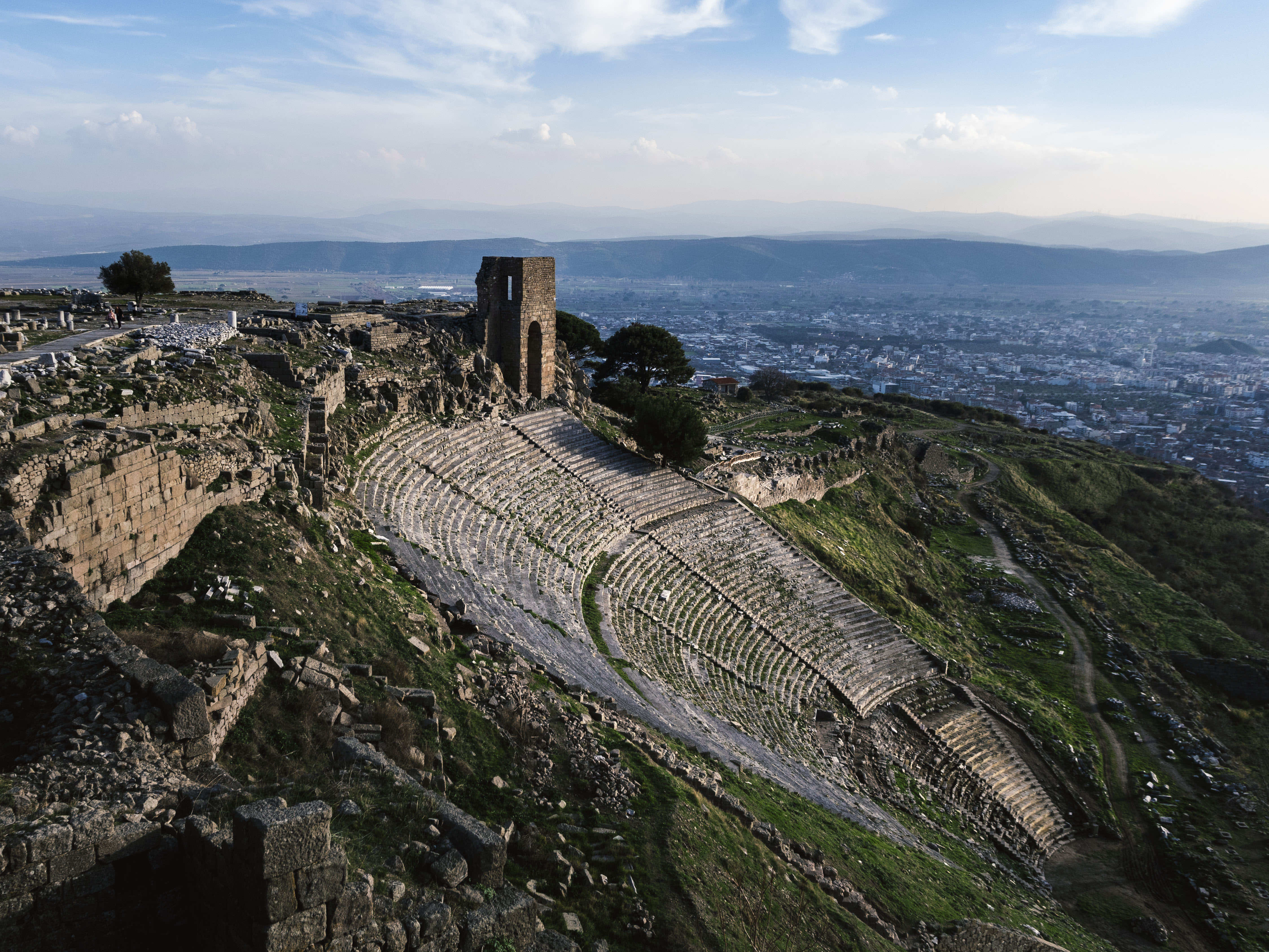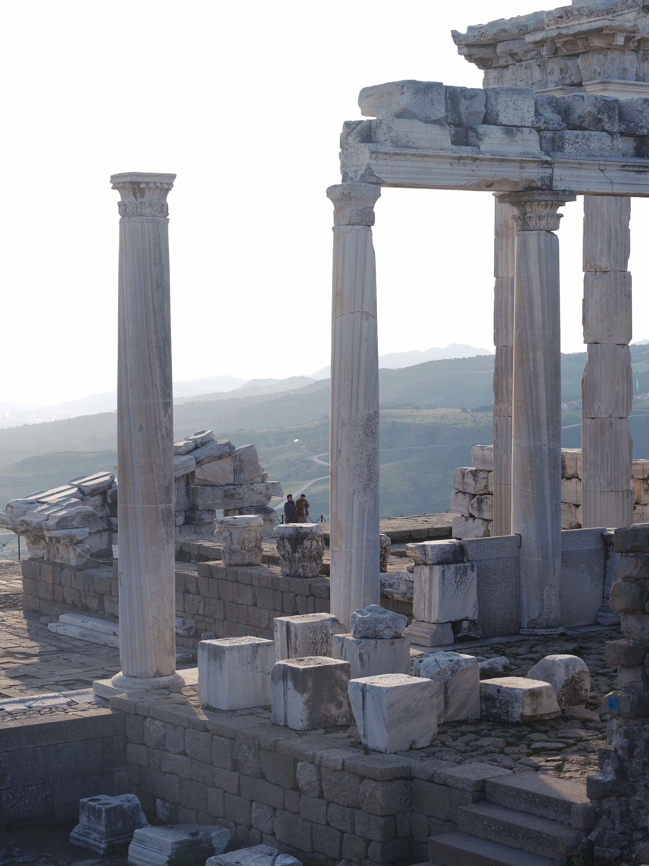 在佩加蒙,面对着古典世界最陡峭的剧场,我们讨论为何 2000 年后我们依然会对希腊化世界的城邦产生粉红色泡泡般的想象,答案或许是「美」。胜败是暂时的,任何文凭文明都有衰落的一天,但如果它美,即使过了几千年后,人们仍然会自然而然地为它辩护,为它倾倒,古希腊城邦的魅力超越了制度和意识形态,根植于人类基因深处,对山海相连、土地肥沃之处的本能向往。山上覆盖着茂密的绿色植被,山下的平原肥沃富饶,海洋中蕴藏着无尽的产出,这种风景唤起的安全与丰足,是刻在人类基因里的原始本能,即便化为废墟,佩加蒙的剧场依然美得令人心醉。想象古典时代的狂狂欢节,当夜幕降临,随着索福克勒斯戏剧的情节推进,舞台背后的天空从碧蓝渐变为火烧云的橙红,再归于深蓝。等到史诗般的剧情收场,工作人员举着火把如星星般点亮,引导观众离开剧场。