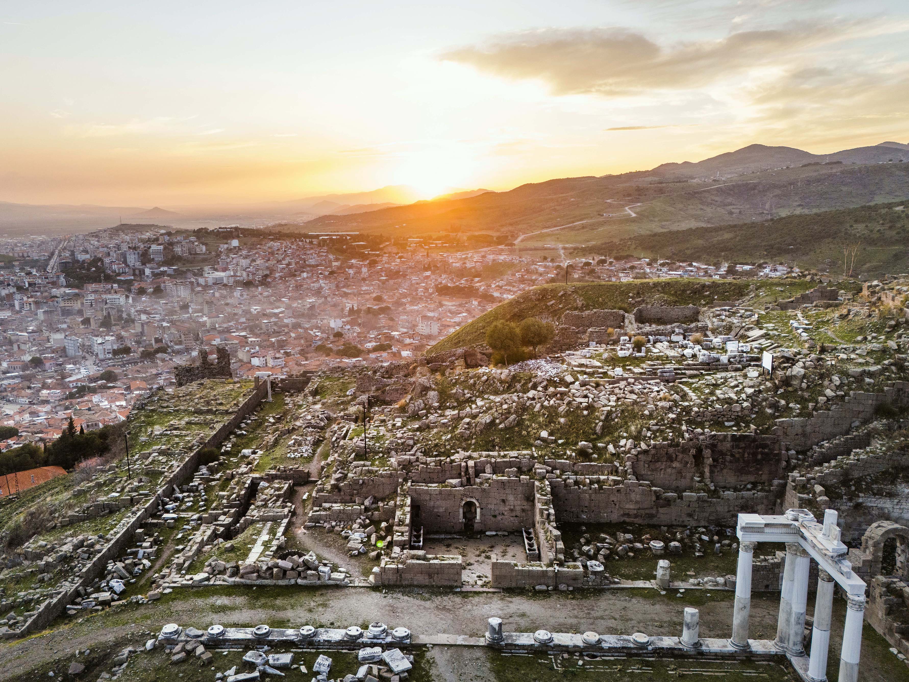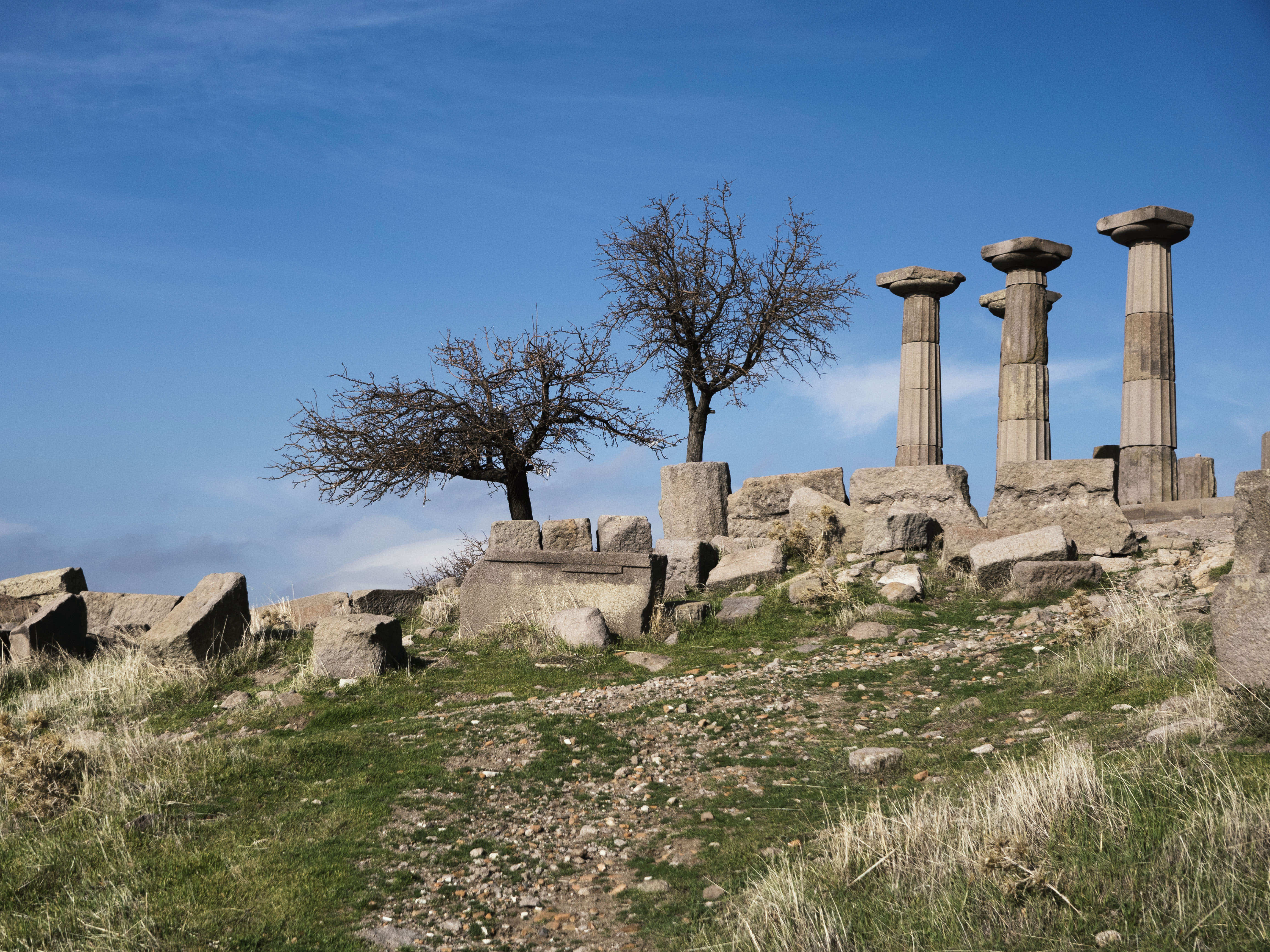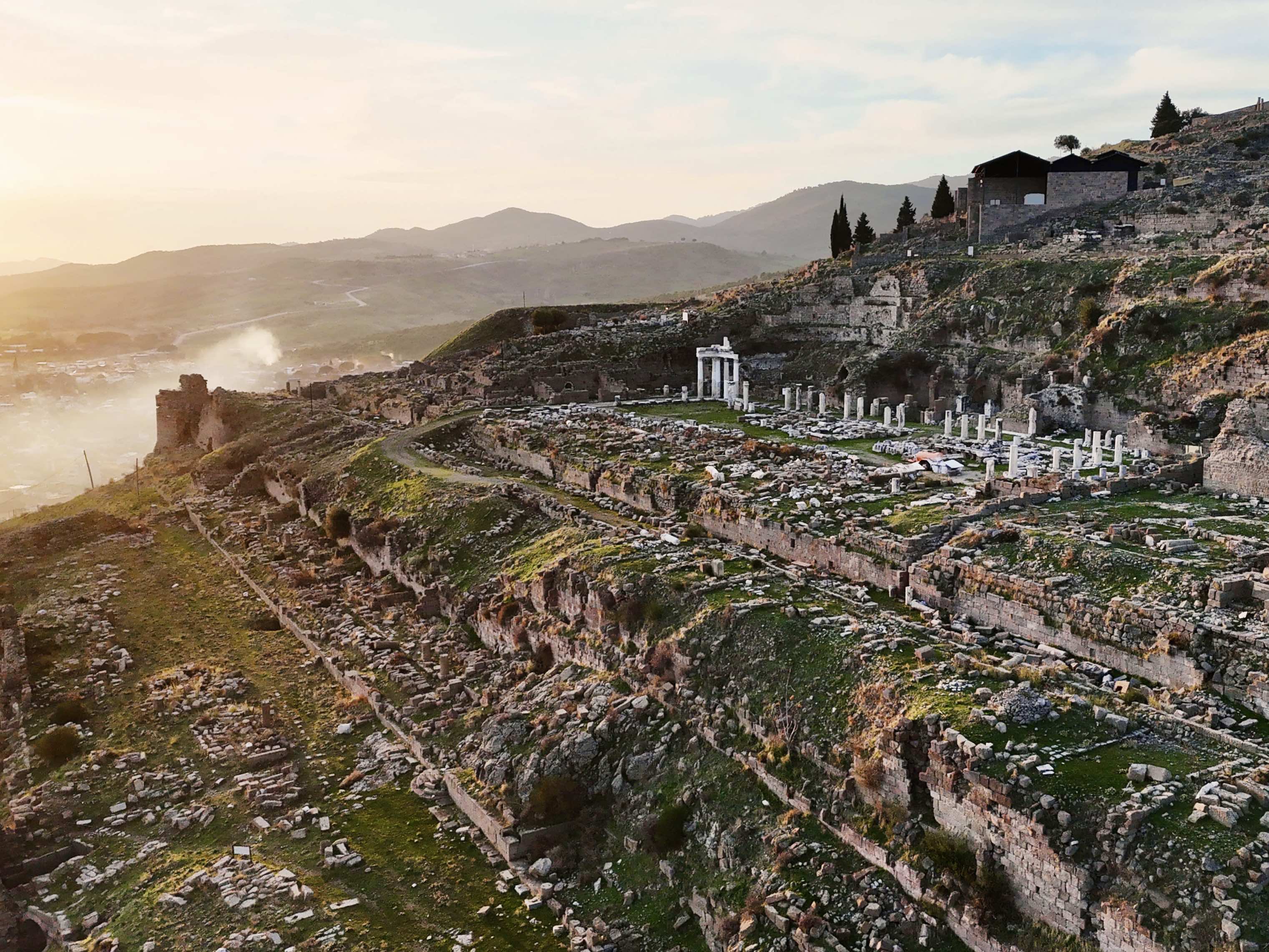 在佩加蒙,面对着古典世界最陡峭的剧场,我们讨论为何 2000 年后我们依然会对希腊化世界的城邦产生粉红色泡泡般的想象,答案或许是「美」。胜败是暂时的,任何文凭文明都有衰落的一天,但如果它美,即使过了几千年后,人们仍然会自然而然地为它辩护,为它倾倒,古希腊城邦的魅力超越了制度和意识形态,根植于人类基因深处,对山海相连、土地肥沃之处的本能向往。山上覆盖着茂密的绿色植被,山下的平原肥沃富饶,海洋中蕴藏着无尽的产出,这种风景唤起的安全与丰足,是刻在人类基因里的原始本能,即便化为废墟,佩加蒙的剧场依然美得令人心醉。想象古典时代的狂狂欢节,当夜幕降临,随着索福克勒斯戏剧的情节推进,舞台背后的天空从碧蓝渐变为火烧云的橙红,再归于深蓝。等到史诗般的剧情收场,工作人员举着火把如星星般点亮,引导观众离开剧场。